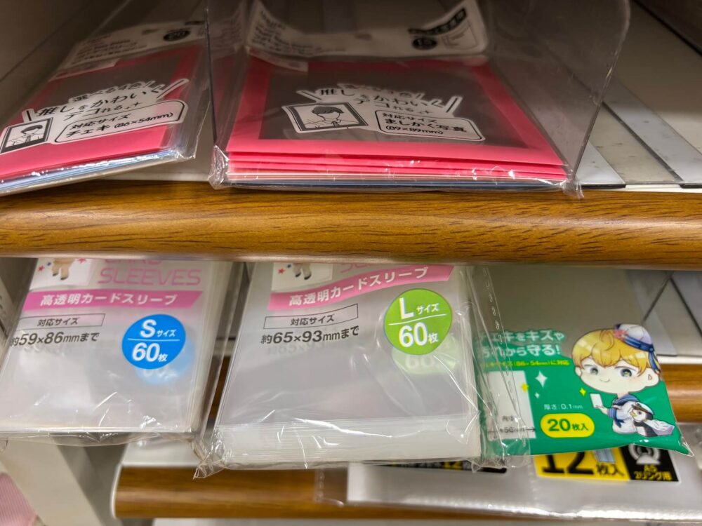 セリアのスリーブ売り場は主に文具コーナーにあり、店舗によってはトレカ専用コーナーやレジ横にも配置されています。
