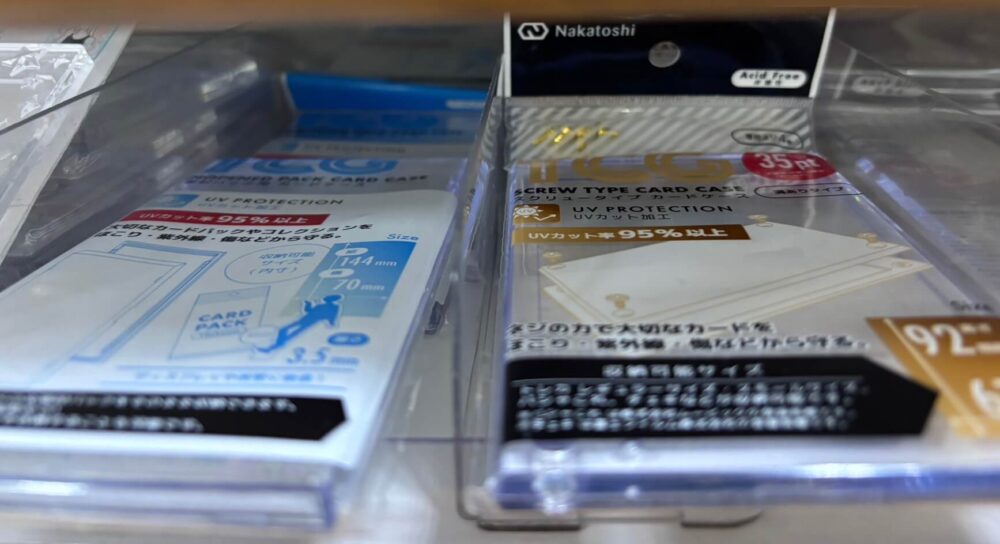 専用コーナーがある店舗では、スリーブの種類も豊富で、透明タイプだけでなく半透明やカラー付きなど選択肢が広がります。